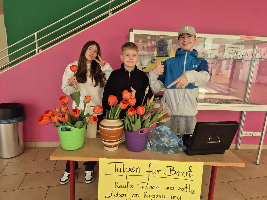 Die Heinrich-von-Kleist-Schule hat an der Aktion „Tulpen für Brot“ teilgenommen. Die Aktion steht unter der Schirmherrschaft des niedersächsischen Ministerpräsidenten Stephan Weil und der saarländischen Ministerpräsidentin Anke Rehlinger. Für die Aktion hat unsere Schule Tulpenzwiebeln geschenkt bekommen; diese wurde von Schülerinnen und Schülern u.a. im Schulgarten eingepflanzt und ihre Aufzucht betreut. Passend zum Frühjahr wurden die Tulpen nun zum Stückpreis von 0,80 EUR in den großen Pausen an Schülerinnen und Schüler sowie Lehrkräfte verkauft. So konnten sie einem lieben Menschen einen Frühlingsgruß entrichten und gleichzeitig Gutes tun: Gemeinnützige Hilfsorganisationen erhalten den Verkaufserlös, um überall auf der Welt die Not ein wenig zu lindern. 2023 z.B. wurde ein Reinerlös von 75.000 EUR erzielt, insgesamt 274 Schulen hatten sich daran beteiligt.