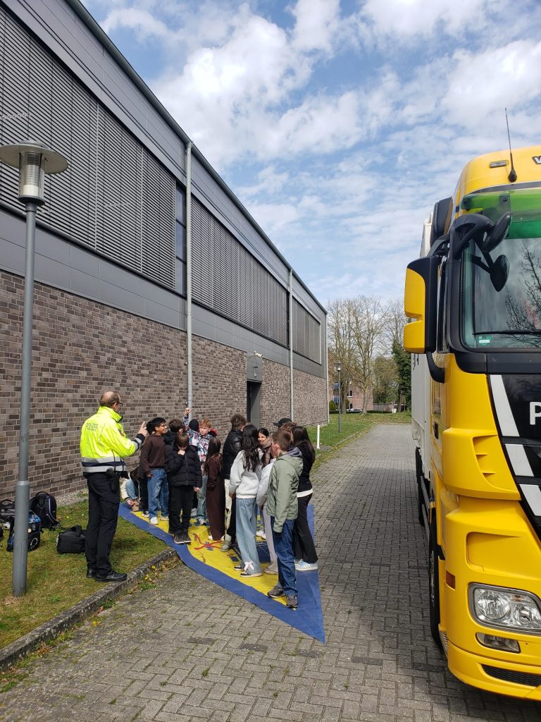 Die Heinrich-von-Kleist-Schule hat daher für den gesamten Jahrgang 5 ein Projekt „Verkehrserziehung“ durchgeführt: In Kooperation mit Polizeioberkommissar Lothar Kammer, Verkehrssicherheitsberater der Polizei Papenburg, wurden die Schülerinnen und Schüler für kritische Punkte auf dem Schulweg sensibilisiert: Besondere Beachtung wurde z.B. dem „toten Winkel“, also dem Bereich um ein Fahrzeug, den ein Fahrer z.B. eines LKWs trotz Spiegeln und Schulterblick nicht einsehen kann, geschenkt. Hier lauern viele Gefahren für Radfahrerinnen und Radfahrer, zu denen viele unserer Schülerinnen und Schüler gehören. Anschaulich wurde mit einem LKW demonstriert, welchen Bereich der „tote Winkel“ umfasst und welche Vorsichtsmaßnahmen geboten sind.